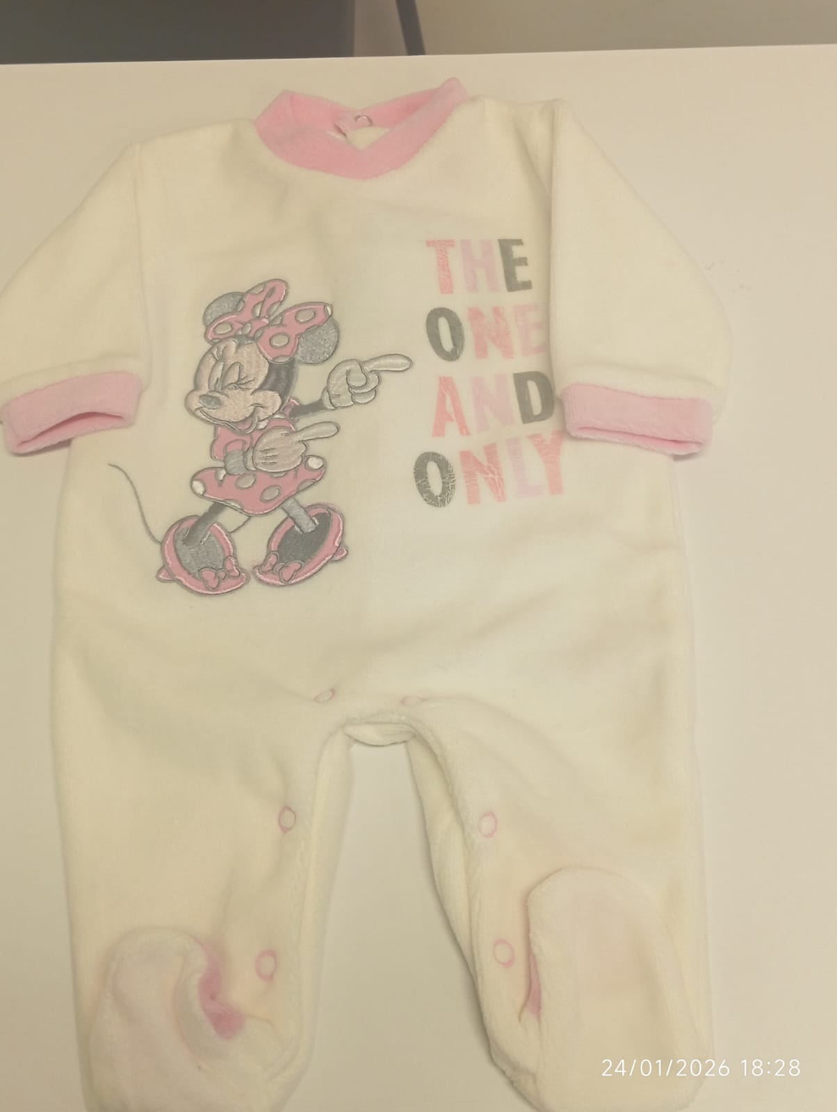 Adorabile tutina in morbida ciniglia per neonata, impreziosita dal simpatico design di Minnie Mouse in rosa. Un capo dolcissimo che unisce comfort e tenerezza, perfetto per coccolare la piccola con stile e fantasia.
